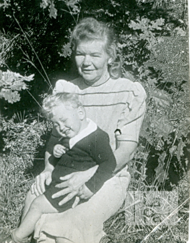 Zoja Orleāne ar mazdēlu Ausmas nometnē Kleinkecā (amerikāņu zonā). Sieviete sēž zālē ar mazu zēnu klēpī. Fonā ir mežs. No kreisās: Valdis Dzintars un Zoja Orleāne.