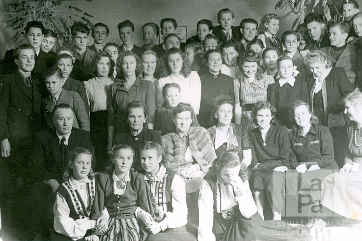 Liela pamatskolas un vidusskolas skolēnu un skolotāju grupa īsi pirms Ausmas nometnes Kleinkecā (amerikāņu zonā) slēgšanas. Cilvēki iekštelpās vairākās rindās – pirmās divas rindas priekšā sēž, otrajā rindā sēž skolotāji; pārējās rindas stāv kājās. Vairākas jaunietes ir ģērbušās tautastērpos. Pirmajā rindā (jaunietes tautastērpos), no kreisās: trešā ? Lemberga, ceturtā Ilona Pētersone. Otrajā rindā, no kreisās: pirmais ? Lembergs (mācītājs), otrā Berta Stakle (skolotāja), trešā ? Lemberga (skolotāja), viņai aiz muguras skolniece Beatrice Klīve, ceturtā ? Klaģiša un septītā ? Soste. Starp otro un trešo rindu stāv: Beatrice Klīve (aiz ? Lembergas). Trešajā rindā, pirmā no labās: "Hermīne Kresse (skolotāja). Trešajā rindā vēl ir redzami: Kārlis Bumbērs, ? Klaģišs, Ivars Edens, Lidija Akipāne, Biruta Gulbe, Inta Sloka (aiz viņas Jānis Līvēns), Māra Knostenberga (aiz viņas Ivars Liepiņš un Ārija Dzene (profilā)), Ausma Macate, Veronika Reineka. Pēdējā rindā, pirmais no labās: Jānis Bēdelis (stūrī). Pēdējā rindā vēl ir redzami: Roberts Bitenieks, Harijs Jancis, Andris Kadeģis, Jānis Bruzītis, Normunds Balodis, ? Jaciņa, Pēteris Kelpis, Oļģerts Gunārs Orleāns.