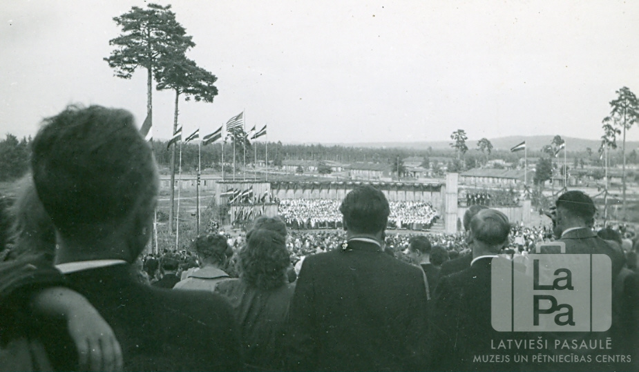 Publikas un estrādes kopskats Dziesmu svētkos Fišbahā (amerikāņu zonā). Skats no augšas, skatītāju aizmugures, uz estrādi tālu priekšā, lejā. Estrādes kreisajā pusē mastos plīvo Latvijas karogi. Fonā, aiz estrādes, ir vienstāvu barakas meža ielokā. Šajos Dziesmu svētkos piedalījās arī jauktais koris "Ausma" no Ausmas nometnes Kleinkecā.