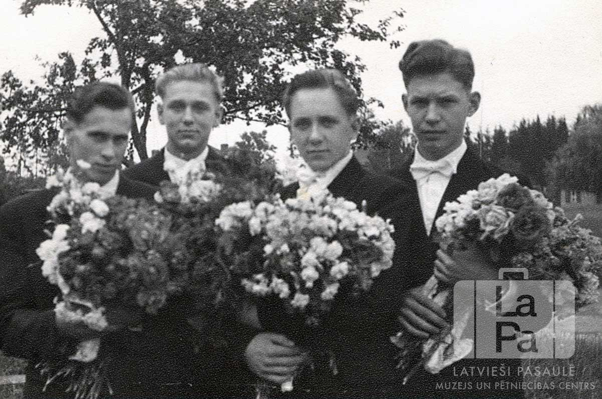 Četri jaunekļi no Ausmas nometnes Kleinkecā (amerikāņu zonā) pēc iesvētību dievkalpojuma Gunzburgas baznīcā. Jaunekļi ģērbušies uzvalkos, ar ziedu pušķiem rokās. Fonā ir koks un lauks. No kreisās: Laimonis Drupa, Ivars Liepiņš, ? Fišers un Oļģerts Gunārs Orleāns.