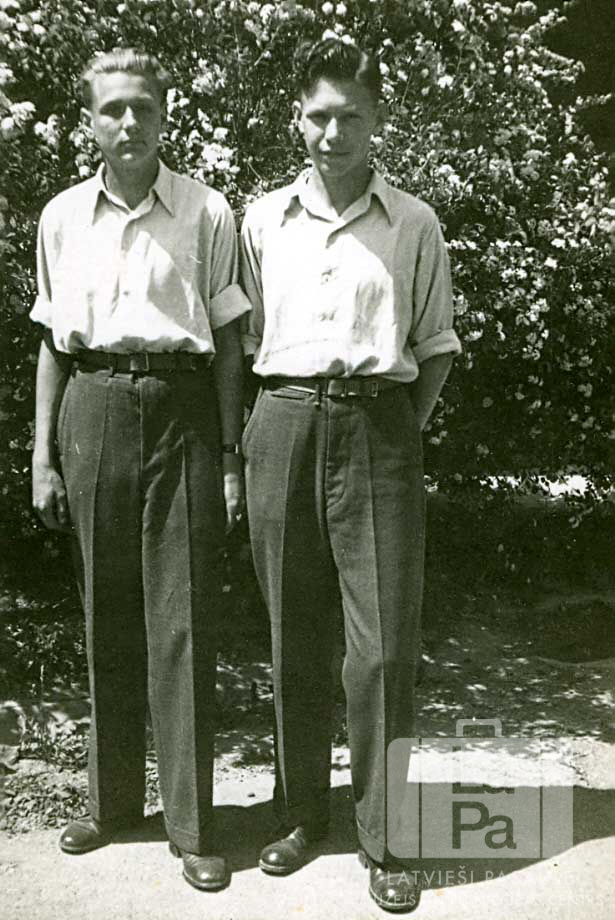 Divi jaunekļi pie ziedoša krūma Ausmas nometnē Kleinkecā (amerikāņu zonā). No kreisās: Ivars Liepiņš un Oļģerts Gunārs Orleāns.