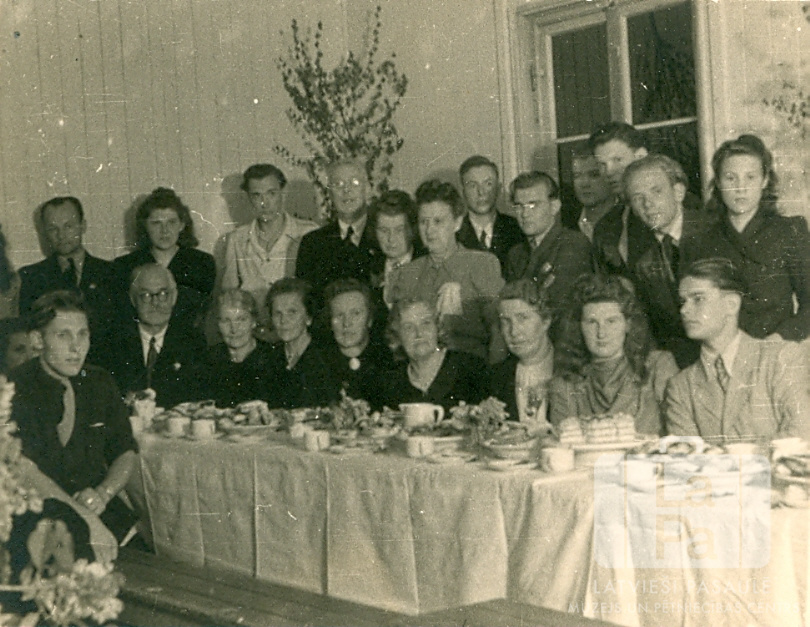 Viesi pie svētku galda ģimnāzijas beigšanas mielastā Ausmas nometnē Kleinkecā (amerikāņu zonā) 1949. gada pavasarī. Cilvēki vairākās rindās iekštelpās, aiz galda, pirmā rinda sēž. Uz galda ir trauki ar ēdieniem. Aizmugurē, labajā pusē, ir logs. Pirmajā rindā, no kreisās Gunārs Bilsens, Mārtioņš Soste (ģimnāzijas direktors), ? Soste (vācu valodas skolotāja), Berta Stakle (matemātikas skolotāja), Nora Klīve (latviešu valodas skolotāja), ? Ansona (vēstures skolotāja), ? Sniķere (anglu valodas skolotāja), Ērika Brasilis un Juris Dragūns. Aizmugurē stāv, no kreisās: E. Putniņš (mācītājs), Ilga Soste, Jānis Bumbērs, ? Bumbērs (fizikas skolotājs), ? Kresse, ? Lemberga (angļu valodas skolotāja), Gļebs Mamatovs, Ēriks Krūmkalns, Jānis Dzenis, Oļģerts Gunārs Orleāns, Andrejs Mierkalns un Larisa Zviedre. Par šo gadījumu Oļģerts Gunārs Orleāns stāsta: "Mani draugi Gunārs un Ēriks beidza ģimnāziju, un es biju uzaicināts viņu beigšanas svinībās. Es biju beidzis ģimnāzijas otro klasi. Rudenī, izceļošanas izredzēm zūdot, es iestājos "melno” vienībā un eventuāli vidusskolas diplomu tomēr ieguvu, un pēc gadiem arī beidzu universitāti."