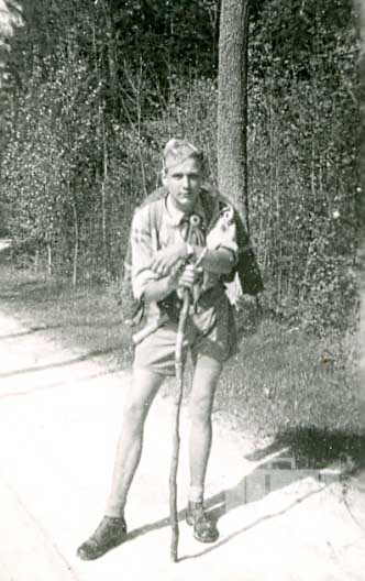 Ivars Liepiņš no Ausmas nometnes Kleinkecā (amerikāņu zonā) stāv uz ceļa roveru sirojuma laikā 1949. gada vasarā. Jauneklis skautu formastērpā ar mugursomu plecos, atbalstījies pret koka nūju. Fonā ir mežs.