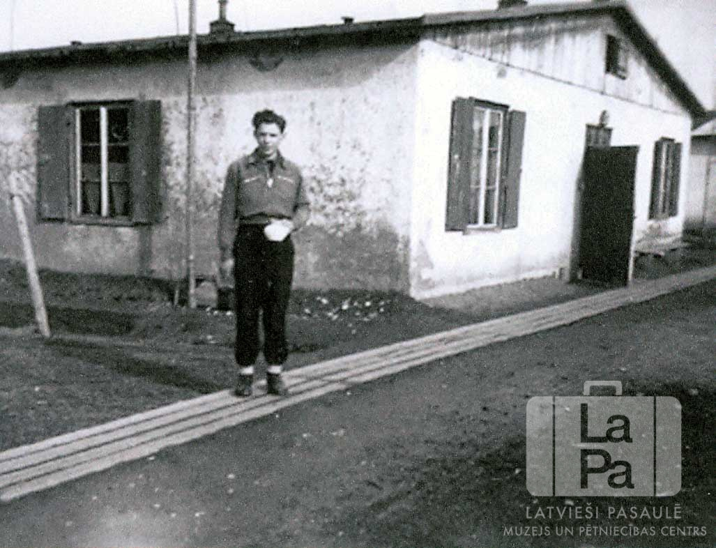 Oļģerts Gunārs Orleāns stāv uz dēļiem pie vienstāvu mūra barakas Ausmas nometnē Kleinkecā (amerikāņu zonā). Rokās viņam ir daļa no kārtējās produktu devas – krūze ar pienu un neliela kanna.