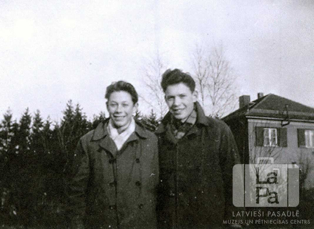 Divi draugi Ausmas nometnē Kleinkecā (amerikāņu zonā) 1950. gada sākumā. Puiši ir ģērbušies mēteļos. Fonā ir egles un divstāvu mūra ēka. No kreisās: Andris Kadeģis un Oļģerts Gunārs Orleāns.