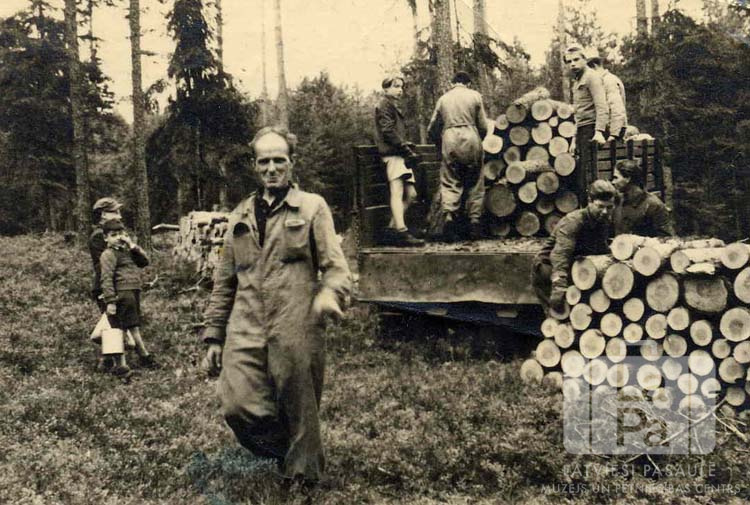 Skauti no "Camp Mack" nometnes Baireitā (amerikāņu zonā) meža darbu laikā palīdz iekraut malku kravas mašīnā 1946. gada rudenī. Jaunieši stāv automašīnā un pie krāmētas zāģētu bluķu kaudzes; priekšplānā tuvojas vīrietis, aiz viņa labajā pusē stāv bērni.