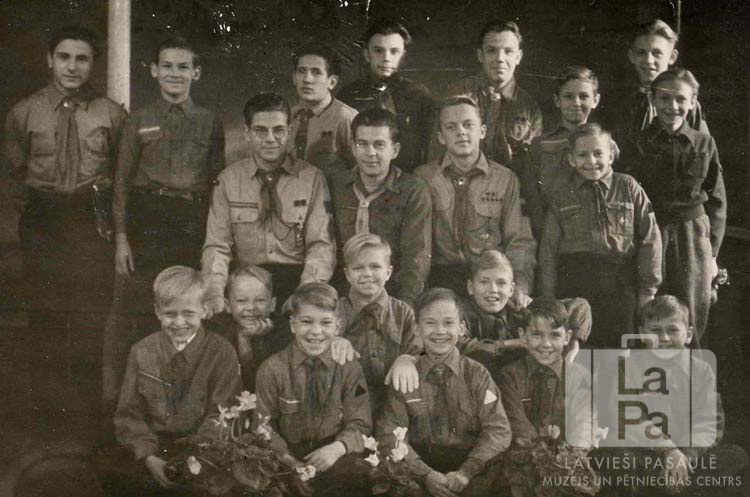 "Camp Mack" nometnes Baireitā (amerikāņu zonā) skautu vienība ar vadītāju. Grupā ir skauti, mazskauti un vadītājs, visi ir ģērbušies formastērpos. Priekšā divas rindas sēž, aizmugurē trīs rindas stāv kājās. Grupā ir redzams: ? Zirnis (vadītājs).