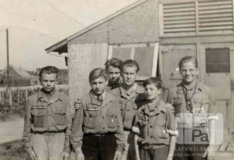 Skautu vienība no "Camp Mack" nometnes Baireitā (amerikāņu zonā) 1946. gada vasarā stāv pie vienstāvu ēkas. Fonā kreisajā pusē, iespējams, ir dārzs, aiz kura ir divas lielas teltis (?). No kreisās: Olģerts Kubuliņš, ? Voskāns, Richards Kubuliņš, ? Zirnis (vadītājs), Juris Pūliņš, Juris Delle.