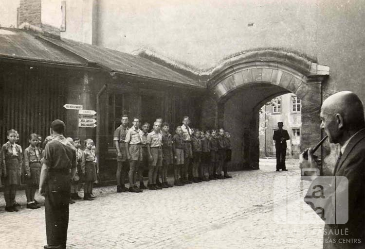 Skauti un gaidas formastērpos stāv ierindā pie mūra vārtiem "Camp Mack" nometnē Baireitā (amerikāņu zonā) 1947. gada vasarā. Mūris pie vārtu ejas ir vairākus metrus biezs. Redzami trīs vīrieši: skautu priekšā skautu formastērpā, priekšplānā labajā pusē ar pīpi mutē un vārtu ejā. Skautu priekšā stāv: ? Zirnis (vadītājs).