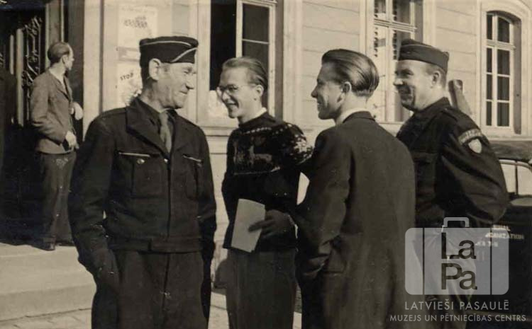 Nometnes policisti "Camp Mack" nometnē Baireitā (amerikāņu zonā) 1948. gada vasarā. Divi vīrieši ir ģērbušies formastērpos. Aizmugurē, kreisajā pusē pie mūra ēkas ieejas, vīrietis skatās uz afišām. Aiz vīriešiem labajā pusē ir tumša automašīna. Priekšā, no kreisās: pirmais ? Dolmanis, ceturtais Pauls Kubuliņš.