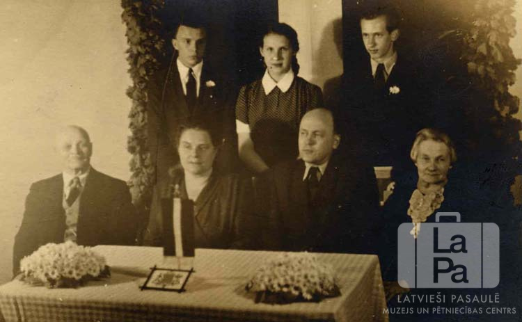 Pamatskolas absolventi ar skolotājiem "Camp Mack" nometnē Baireitā (amerikāņu zonā) absolventi sēž pie galda. Četri skolotāji sēž priekšā aiz galda, uz kura ir divas ziedu kompozīcijas ar mazu Latvijas karogu un ģerboni pa vidu. Aizmugurē stāv trīs skolēni. Priekšā, no kreisās: ? Ratnieks, ? Ozoliņa, ? Rungulis. Aizmugurē, no kreisās: Olģerts Kubuliņš, Vija Velītis, Laimonis Krūmiņš.