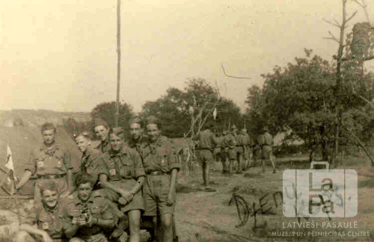 Angļu zonas sastādītās Rīgas skautu grupas Dzeņu kops formastērpos Miera džamborejā Francijā no 1947. gada 9. līdz 18. augustam. Tajā piedalījās arī Oļģerts Sniedze no Osnabrikas nometnes (angļu zonā). Skautu grupa trīs rindās, priekšā divi skauti sēž uz zemes. Viens skauts tur rokā gaišu, mazu Dzeņu kopa karogu. Fonā, labajā pusē, prom dodas cita skautu grupa. Fonā ir teltis. Uz fotogrāfijas apakšējā kreisā stūra rokrakstā ir rakstīts: "Dzeņu kops".