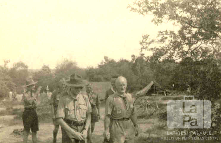 Latviešu skautu vadītāji ar viesiem Miera džamborejā Francijā no 1947. gada 9. līdz 18. augustam. Tajā piedalījās arī Oļģerts Sniedze no Osnabrikas nometnes (angļu zonā). Visi vīrieši ir ģērbušies formastērpos. Fonā, meža ielokā, ir teltis.