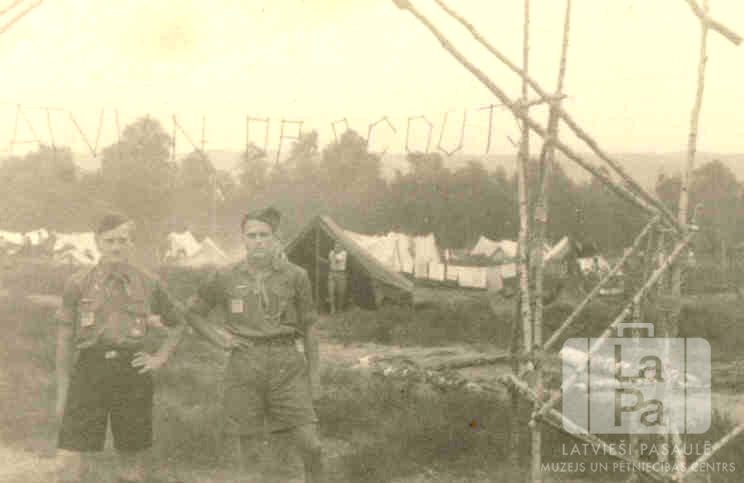 Divi skauti formastērpos stāv latviešu nometnes vārtos Miera džamborejā Francijā no 1947. gada 9. līdz 18. augustam. Tajā piedalījās arī Oļģerts Sniedze no Osnabrikas nometnes (angļu zonā). Vārti ir veidoti no tieviem bērza koka stumbriem; vārtos virs puišiem ir no zariem veidots nosaukums: "LATVIAN DP SCOUTS". Nometnē ir daudz telšu; pie tuvākās telts ieejas stāv jaunietis. Aiz nometnes ir mežs. No kreisās: Uldis Missiņš un Pēteris Ārgals.