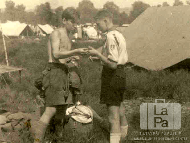 Divi skauti apmainās piemiņas zīmēm telšu nometnē Miera džamborejā Francijā no 1947. gada 9. līdz 18. augustam. Tajā piedalījās arī Oļģerts Sniedze no Osnabrikas nometnes (angļu zonā). Viens jaunietis ir skautu formastērpā; otrs stāv šortos. Pirmais no kreisās: Laimonis Zandbergs.