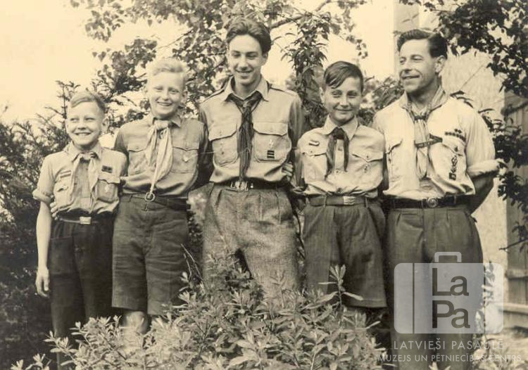 Četri Raktes 109. skautu vienības skauti ar vadītāju Osnabrikas nometnē (angļu zonā). Fonā ir krūms; labajā pusē ir redzama mūra ēka. No kreisās: trešais Olģerts Sniedze, piektais nezināms (vadītājs).