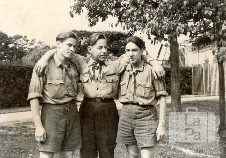 Divi Raktes 109. skautu vienības skauti ar vadītāju Osnabrikas nometnē (angļu zonā). Visi trīs ir ģērbušies formastērpos. Fonā ir dzīvžogs un ēka aiz vārtiem. No kreisās: otrais nezināms (vadītājs), trešais Oļģerts Sniedze.