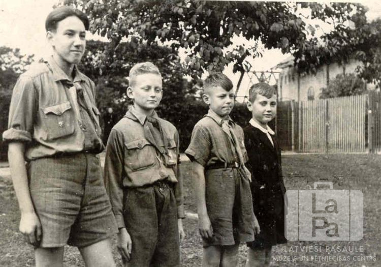 Četri Raktes 109. skautu vienības skauti Osnabrikas nometnē (angļu zonā). Fonā koks, dzīvžogs un ēka aiz vārtiem. Pirmais no kreisās: Olģerts Sniedze.