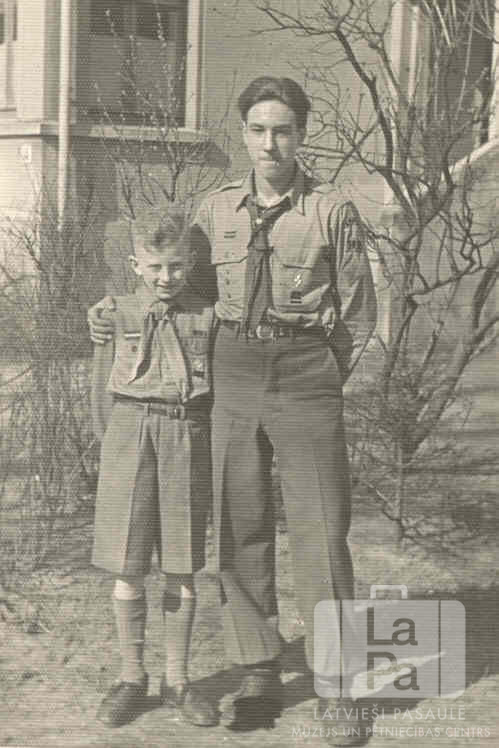 Divi Raktes 109. skautu vienības skauti pie ēkas Osnabrikas nometnē (angļu zonā). Jaunietis un mazs zēns; abi formastērpos. Fonā ir krūmi bez lapām. Otrais no kreisās: Olģerts Sniedze.