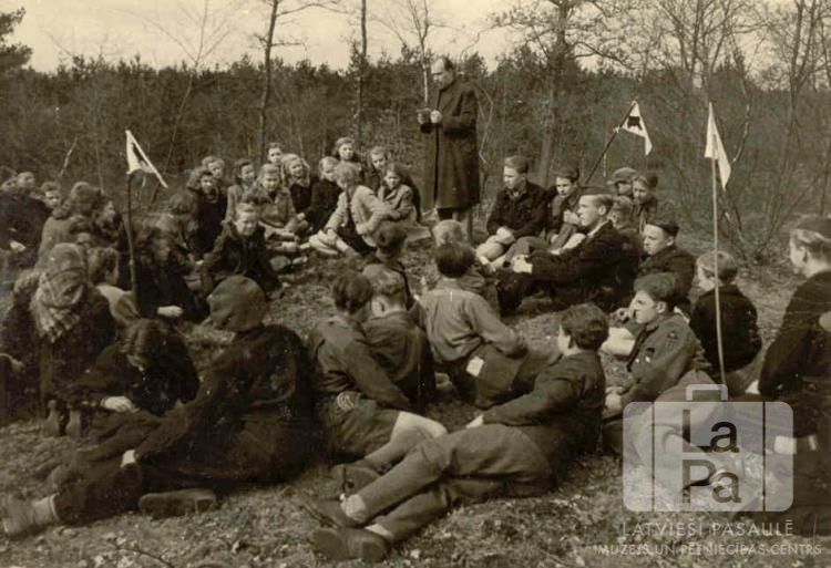 Lielupes skautu un gaidu novadu kopnieku, kopnieču sanāksme Grēvenes nometnē (angļu nometnē). Jaunieši sēž uz zemes; viņu vidū stāv runātājs. Trīs jaunieši ir pacēluši mazus, gaišus karogus. Fonā ir mežs.