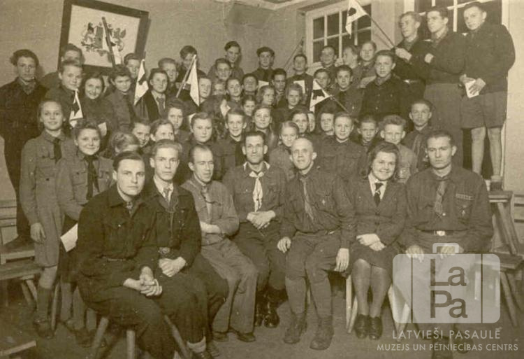 Lielupes skautu un gaidu novadu kopnieku, kopnieču sanāksme Grēvenes nometnē (angļu nometnē). Liela jauniešu grupa iekštelpās. Daudzi jaunieši ir ģērbušies formastērpos. Vairākiem jauniešiem rokās ir mazi karogi. Fonā kreisajā pusē uz sienas ir Latvijas ģerbonis; labajā pusē aiz jauniešiem ir divi logi.