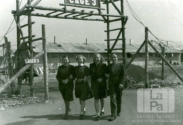 Četri cilvēki pie Mercfeldas nometnes vārtiem (amerikāņu zonā) 1946. gada Lieldienās. Trīs jaunas sievietes un viens vīrietis. Vārtu eja ir veidota no kokiem, ar dzeloņstiepļu žogu abās pusēs. Vārtu kreisajā pusē ir zīme "LAGER 3". Nometnē ir redzama gara vienstāvu baraka. No kreisās: Veronika Dzene, Paulīne Dzene (pr. Zadvinska), Antonija Dzene un nezināms.