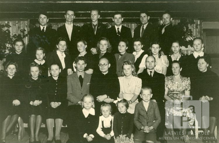 Katoļu draudze ar mācītāju Valkas nometnē Nirnbergā (amerikāņu zonā). Liela cilvēku grupa četrās rindās iekštelpās; priekšā četri sēž bērni. Pirmajā rindā, no kreisās: pirmā Veronika Bičkovska, otrā ? Ozola, ceturtais Romualds Dzenis (ērģelnieks), piektais Juris Pudāns (prāvests), sestā Paulīne Zalāne. Trešajā rindā, no kreisās: ceturtā Paulīne Dzene un sestā Romualda Kriškijāne. Ceturtā rindā pirmais Eduards Bacāns un trešais Vitālijs Tarbunas.