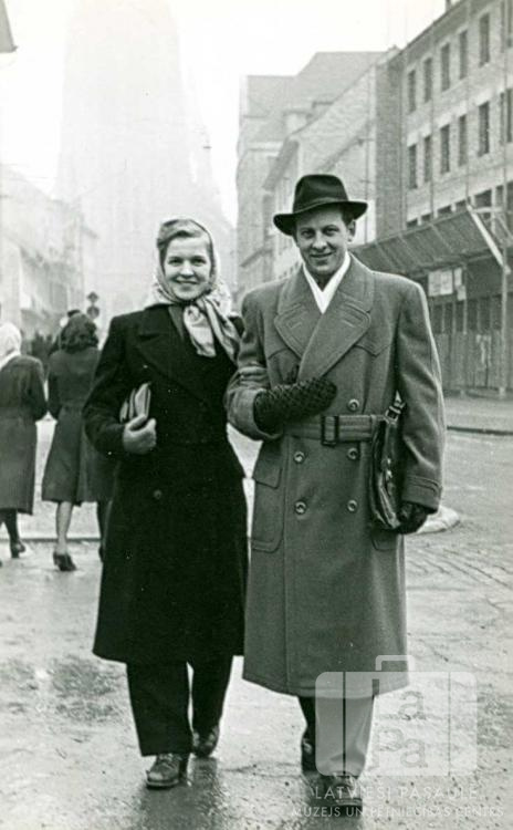 Jauns pāris pastaigājas pa ielu Ulmas pilsētā (amerikāņu zonā). Fonā uz ielas pastaigājas citi cilvēki; abpus ielai ir ēkas. No kreisās: Paulīne Dzene un Zigfrīds Zadvinskis.