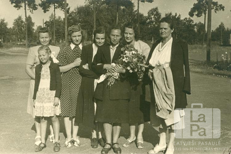 Atvadas no aizbraucējas Valkas nometnē Nirnbergā (amerikāņu zonā). Grupa ar sievietēm un vienu mazu meiteni; vienai sievietei rokās ir ziedu pušķis. Fonā ir mežs. No kreisās: Vija Štokmane, Elza Štockmane, Paulīne Dzene, Romualda Kriškijāne, nezināms, Regīna Čiževska un Marija Čiževska.