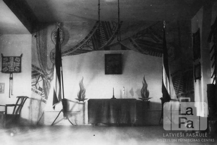 Daugmales 51. skautu vienības mītne Freimaņa nometnē Minhenē (amerikāņu zonā). Vidū, pie sienas, ir galds ar liesmu dekorācijām abās pusēs un portretu uz sienas, virs galda. Galdam abās pusēs, aiz dekorācijām, ir Latvijas karogi. Siena ir dekorēta ar rakstainiem audumiem.