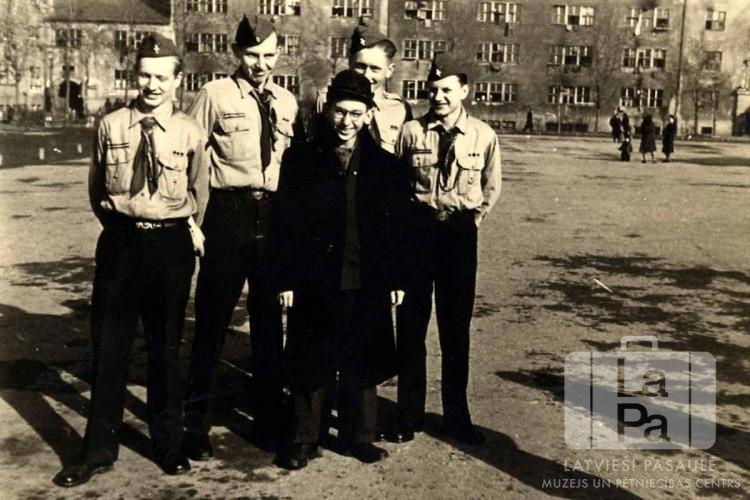 Paulis Dermanis atvadās no Daugmales 21. skautu vienības draugiem centrālajā laukumā Varnera nometnē pie Minhenes (amerikāņu zonā), pirms došanās uz ASV. Četri puiši formastērpos, viens puisis garā, tumšā mētelī. Fonā pie vairākstāvu kazarmju ēkas pastaigājas cilvēki. No kreisās: Maksis Vējiņš, Vīgo Rauda, Paulis Dermanis (tumšā mētelī), Guntis Veits un Zigfrīds Jirgens.