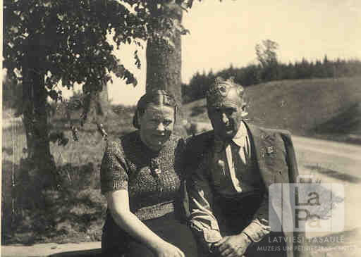 Menskas pāris pie koka netālu no Valkas nometnes (amerikāņu zonā) ap 1946.–1947. gadu. Sieviete un vīrietis sēž saulē, fonā lauku ceļš un koks, vīrietim žakete uzmesta pār pleciem. Ida Menska (dzim. Runģis) un Pēteris Menska.
