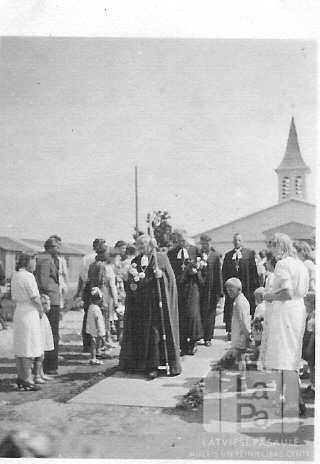Baznīcas svētki baznīcā Valkas nometnē Nirnbergā (amerikāņu zonā) ap 1945. gadā. Mācītāji nāk pa celiņu, kura malas ir izpušķotas ar zaļumiem, cilvēki stāv gar malām. Fonā koka baznīca.