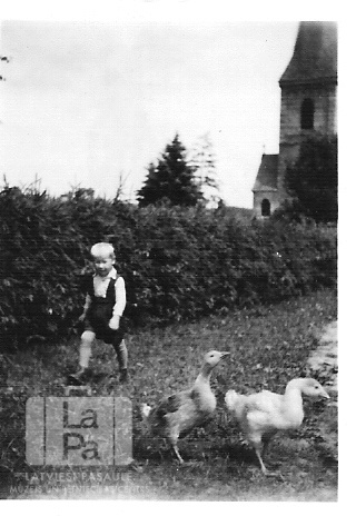 Pāvils Menska bērnībā skrien pakaļ zosīm Groshābersdorfā (amerikāņu zonā) ap 1946. gadu. Fonā dzīvžogs un baznīca (?). Nometnes iedzīvotāji zosis turēja ēšanai.