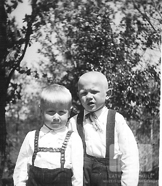 Divi mazi zēni stāv dārzā Valkas nometnē Nirnbergā (amerikāņu zonā) ap. 1946. gadu. Zēniem ir gaiši krekli un bikšu lentes/ bikšturi. Fonā augļu koki. No kreisās: Pāvils Menska un Juris Ritums.