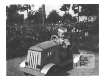Pāvils Menska sēž rotaļu automašīnā dārzā Valkas nometnē Nirnbergā (amerikāņu zonā) 1945.–1946. gadā. Fonā aug puķes un atsevišķi koki; labajā pusē tālumā ir redzama ēka. Par šo gadījumu Pāvils Menska stāsta: "Es ar savu jauno auto, kas tēvam maksāja nezinu cik daudz cigaretes."