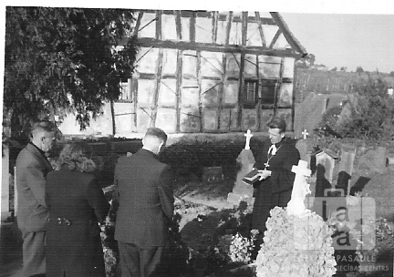 Annas Menskas bēres baznīcas kapsētā Groshābersdorfā (amerikāņu zonā) ap 1945. gadu. Trīs cilvēki stāv pie kapa kopas, aiz kapa stāv mācītājs amata tērpā, ar grāmatu rokās. Fonā ir gaiša vairākstāvu ēka. No kreisās: Pēteris Menska, Ida Menska (dz. Ruņģis), Hermanis Menska un ? Turks (mācītājs no Valkas nometnes Nirnbergā).