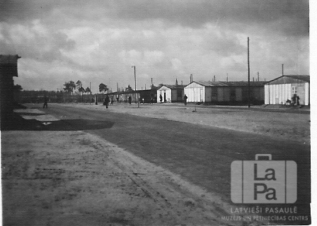 Plata iela Valkas nometnē Nirnbergā (amerikāņu zonā) ap 1945. gadu. Pa ielu tālumā pastaigājas cilvēki. Labajā pusē zemas vienstāvu koka barakas