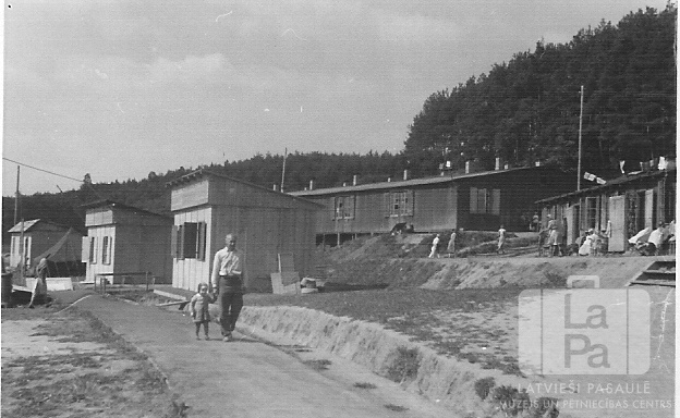 Vīrietis ar mazu bērnu pie rokas pastaigājas Valkas nometnē Nirnbergā (amerikāņu zonā) ap 1945. gadu. Aiz nācējiem ir zemas vienstāvu koka ēkas; labajā pusē ir garākas vienstāvu mūra barakas. Fonā mežs.