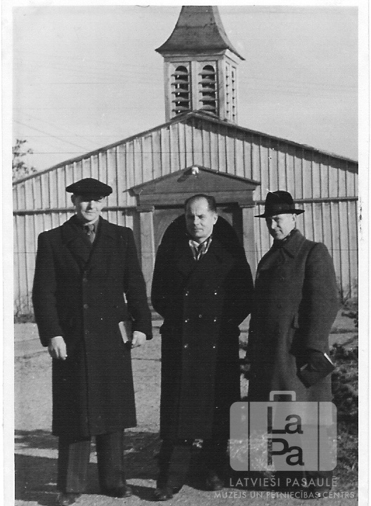 Trīs draugi mēteļos stāv pie koka baznīcas Valkas nometnē Nirnbergā (amerikāņu zonā) ap 1945. gadu. Divi vīrieši rokā tur grāmatas. Aizmugurē ir zema vienstāvu koka ēka ar torni. No kreisās: Ādolfs Ozols, Pēteris Ruņģis, Hermanis Menska.