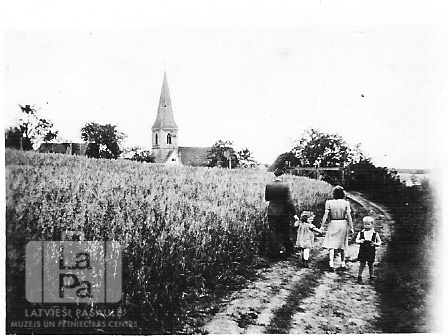 Četri cilvēki uz ceļa pie labības lauka pie Valkas nometnes Nirnbergā (amerikāņu zonā) ap 1945. gadu. Vīrietis, sieviete un divi mazi bērni. Ceļš ved uz mūra baznīcu ar smailu torni. Ceturtais no kreisās: Pāvils Menska.