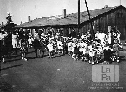 Bērnu parāde Valkas nometnē Nirnbergā (amerikāņu zonā). Bērni ar audzinātājām iet pa ielu 1945–1946. gadā. Visi zēni gaišos kreklos un biksēs, dažas meitenes tautastērpos. Visiem bērniem rokās mazi Latvijas karogi. Fonā ir zema viensstāvu koka baraka.