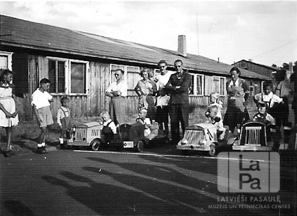 Četri mazi zēni sēž mazās rotaļu automašīnās rindā pie starta līnijas auto sacīkstēs Valkas nometnē Nirnbergā (amerikāņu zonā) ap 1946. gadu. Apkārt sastājušies skatītāji. Fonā ir vienstāvu koka baraka. Pirmajā automašīnā kreisajā pusē sēž Pāvils Menska.