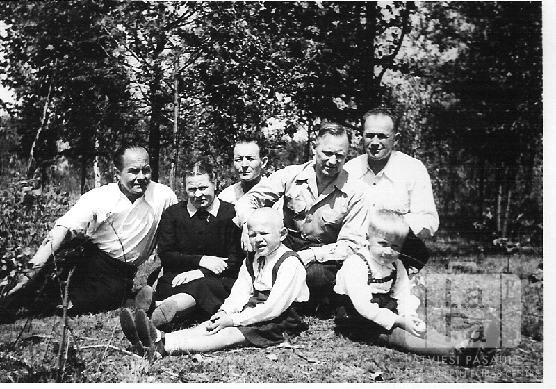 Mensku ģimene ar draugiem piknikā pie Valkas nometnes Nirnbergā (amerikāņu zonā) ap 1946. gadu. Cilvēki sēž uz zemes, priekšā ir divi mazi zēni. Fonā ir mežs.