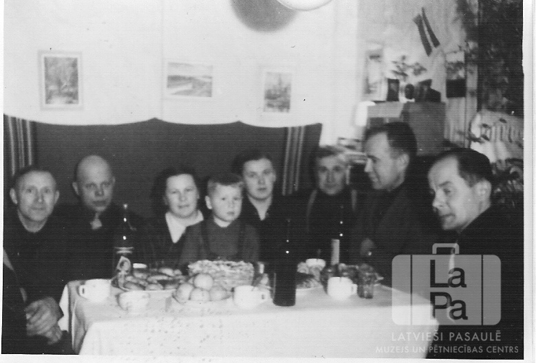 Mensku ģimenes svinības barakā Valkas nometnē Nirnbergā (amerikāņu zonā) ap 1945. gadu. Astoņi cilvēki sēž ap galdu. Galds ir klāts ar baltu galdautu; uz tā ir kafijas krūzes, alus pudeles, ēdieni. Aizmugurē uz sienas ir piesprausta sega, virs tās ir bildes. No kreisās: trešā Ida Menska (dz. Ruņģis), ceturtais Pāvils Menska (bērnībā; sēž mātei klēpī).