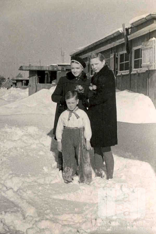 Divas draudzenes un zēns stāv sniegā Frīdrihsortas nometnē Ķīlē (angļu zonā) 1946. gada ziemā. Meitenes ir ģērbušās mēteļos, zēns biksēs un gaišā kreklā ar prievīti. Fonā lielas kupenas pie vienstāvu koka barakas. Priekšā stāv Juris Skrastiņš. Aizmugurē, no kreisās: Anda Kalniņa un Pegija Skrastiņa (pr. Klausa).