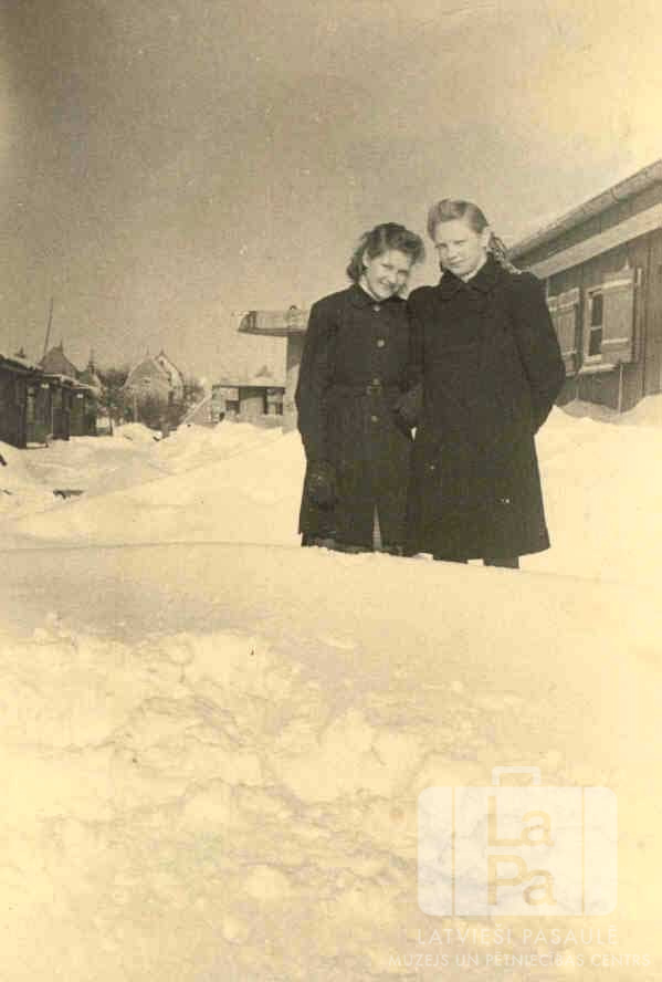 Divas draudzenes mēteļos stāv dziļā sniegā Frīdrihsortas nometnē Ķīlē (angļu zonā) 1946. gada ziemā. Fonā abās pagalma pusēs ir redzamas vienstāvu koka barakas. No kreisās no kreisās: Lija Lazdiņa un Pegija Skrastiņa (pr. Klausa). Par šo gadījumu Pegija Klausa (dz. Skrastiņa) stāsta: "Pirmā ziemā Ķīles Fridrichsortas DP nometnē bija šausmīgi daudz sniega un ļoti auksts."