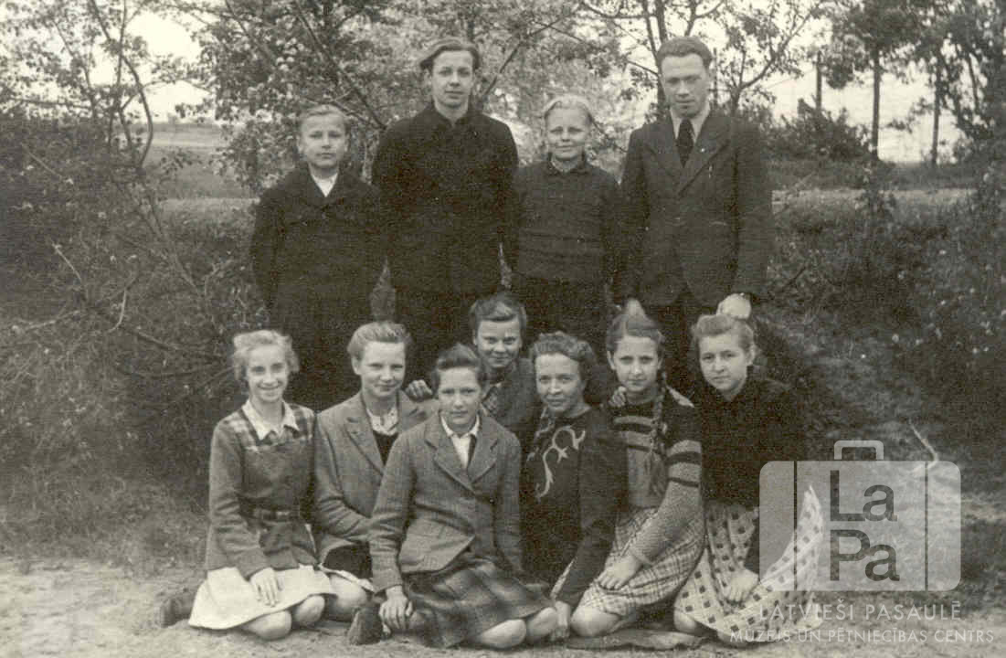 Pamatskolas 6. klase divās rindās Frīdrihsortas nometnē Ķīlē (angļu zonā) 1946. gada rudenī. Jaunietes sēž priekšā uz zemes, puiši ar klases audzinātāju stāv aizmugurē kājās. Fonā krūmi, aiz tiem lauks. Skolēni atrodas netālu no skolas barakas. Priekšā, no kreisās: Lilija Kārkliņa, Pegija Skrastiņa (pr. Klausa), Lija Lazdiņa, Lilija Rušmane, ? Korps (sieviete tumšā džemperī), Skaidrīte Petrovica un Gita Nodieva. Aizmugurē, no kreisās: Donāts Indāns, Ivars Līcis, Vilhelms Adlers un Jāzeps Viļums (klases audzinātājs).