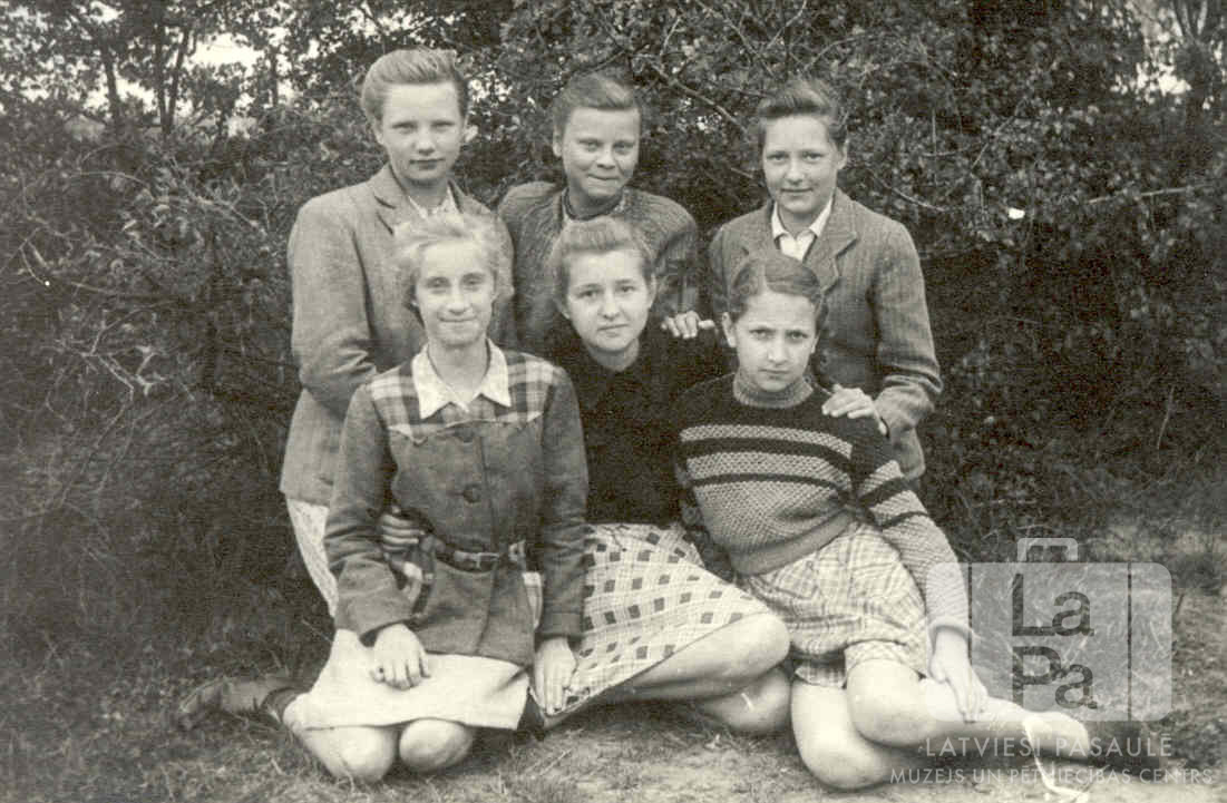 Pamatskolas 6. klases skolnieces sēž uz zemes divās rindās Frīdrihsortas nometnē Ķīlē (angļu zonā) 1946. gada rudenī. Fonā ir krūmi. Priekšā, no kreisās: Lilija Kārkliņa, Gita Nodieva un Skaidrīte Petrovica. Aizmugurē, no kreisās: Pegija Skrastiņa, Lilija Rušmane un Lija Lazdiņa.