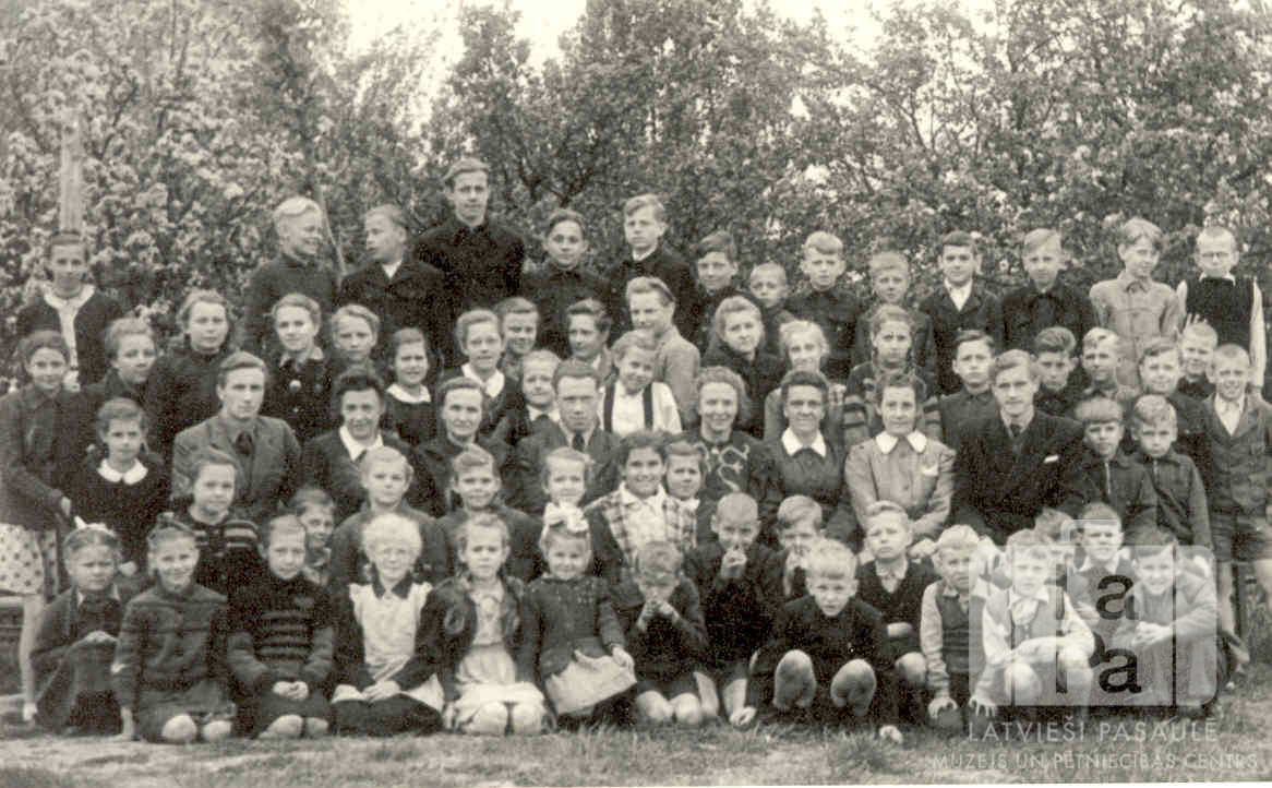Liela pamatskolas skolēnu un skolotāju grupa vairākās rindās Frīdrihsortas nometnē Ķīlē (angļu zonā). Fonā ir ziedoši koki. Pirmajā rindā, no kreisās: trešā Vija Lazdiņa un devītais Ivars Kārkliņš. Otrajā rindā, no kreisās: trešā Anda Kalniņa, ceturtā Anita Kalniņa, piektā Inta Kalniņa un sestā Karīna Brencēna. Trešajā rindā sēž skolotāji, no kreisās: otrais Leons Vīksne, trešā Z. Rudzroga, ceturtā E. Vilka, piektais Jāzeps Viļums, sestā L. Karpa, septītā ? Zdarovska, astotā V. Saptupa. Ceturtajā rindā ir redzamas: Daina Skrapa, Ligita Elerte, Marta Cinkus, Anda Kalniņa, Ausma Veita, Gunta Gosta, Māra Jostone, Ruta Jostone, Lilija Rušmane, Lija Lazdiņa, Ilze Grīnberga, Pegija Skrastiņa (pr. Klausa), Gita Nodieva, Lilija Kārkliņa un Skaidrīte Petrovica. Pēdējā rindā ir redzami: Vilhelms Adlers, Donāts Indāns, Ivars Līcis, Gunārs Pinnis un Valdis Nodievs.